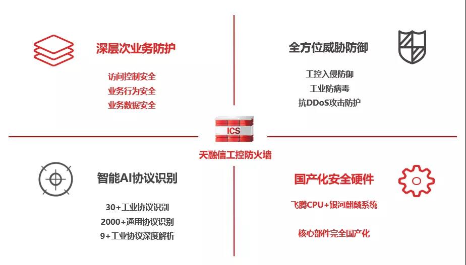 天融信工控防火墙采用“白+黑”组合方式制定合理化安全防护策略,从访问控制、业务行为、业务数据三个层面解决源自互联网和生产内网的安全威胁,精准发现和阻断入侵攻击及病毒传播途径,帮助客户实现工控网络全方位、深层次的安全防护,有效保障生产系统连续稳定运行。