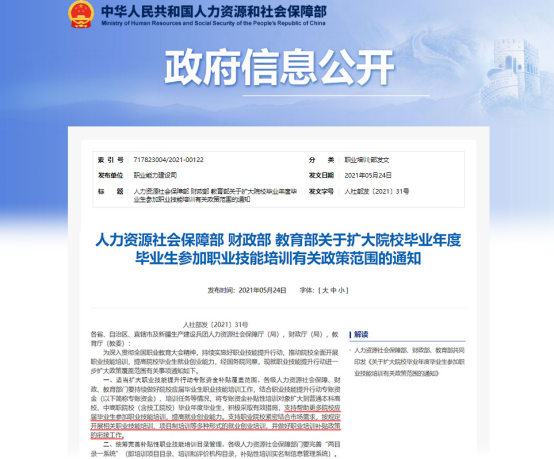 为深入贯彻全国职业教育大会精神,持续实施好职业技能提升行动,推动院校全面开展职业技能培训,提高院校毕业生就业创业能力,国家职业能力建设司近日发布《关于扩大院校毕业年度毕业生参加职业技能培训有关政策范围的通知》。