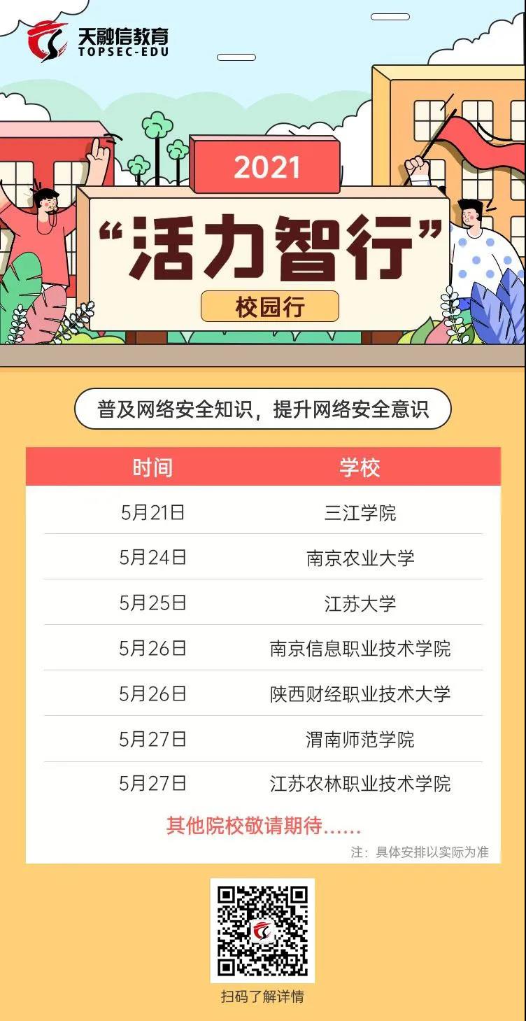 5月下旬,天融信网络安全团队的讲师们分别走入江苏大学、南京农业大学、三江学院、南京信息职业技术学院、陕西财经职业技术学院、江苏农林职业技术学院、渭南师范学院等院校,开展网络安全知识普及、《网络安全法》普及和网络安全行业职业技能普及讲座。