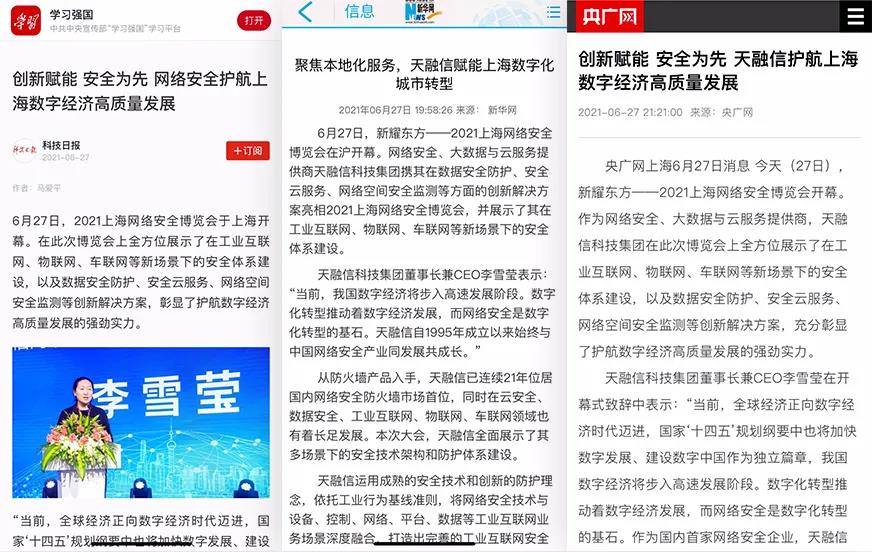 学习强国、新华网、央广网报道天融信参加“新耀东方——2021上海网络安全博览会暨高峰论坛”