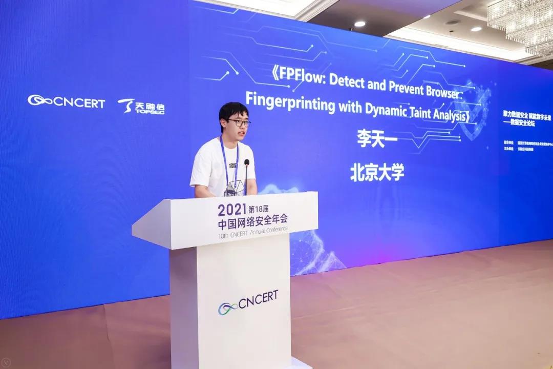 北京大学李天一分享了题为“FPFlow: Detect and Prevent Browser Fingerprinting with Dynamic Taint Analysis”的优秀论文。论文设计并实现了一种基于动态污点分析的浏览器指纹检测与防御技术FPFlow。在实验中发现66.6%的网站实际部署了浏览器指纹,对用户的隐私造成较大的威胁。同时,FPFlow能够在可接受的时间开销下有效地对基于浏览器指纹的攻击进行防御。