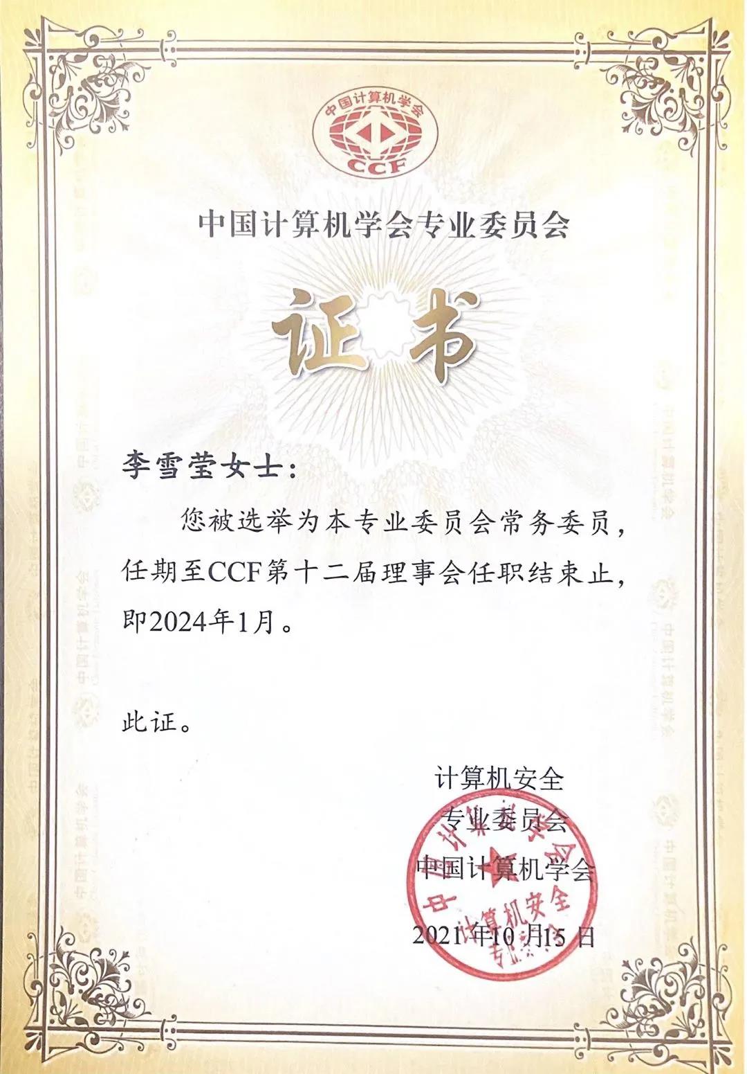 天融信李雪莹博士当选中国计算机学会计算机安全专业委员会常务委员
