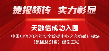 近日,中国电信发布“2021年安全数据中心之态势感知模块(集团及31省)建设工程-省态势感知软件中标候选人公示”,天融信凭借深厚的研发实力与持续技术创新实践能力成功入围。