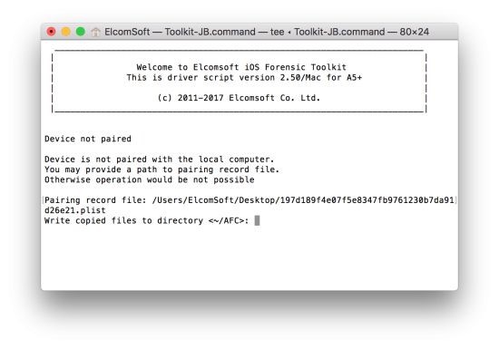 4.如果该设备尚未与电脑连接,则系统会提示你输入一个锁定文件,以提供锁定记录的路径,此时,当出现提示时,可以将锁定文件拖放到iOS Forensic Toolkit窗口中。此时,你就有了关于锁定文件和它们的准确位置的全面的记录信息。如果锁定文件有效,系统还会提示你保存媒体文件的路径,默认情况下为AFC,位于Windows上的当前文件夹或macOS上的用户Home文件夹下。