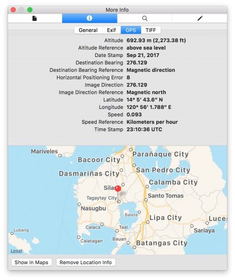 提取的图像可能包含EXIF信息,其中位置数据可以说是最具争议性的,在macOS上,你可以在预览应用程序中选择 [Tools] 中的 [Show Inspector] :